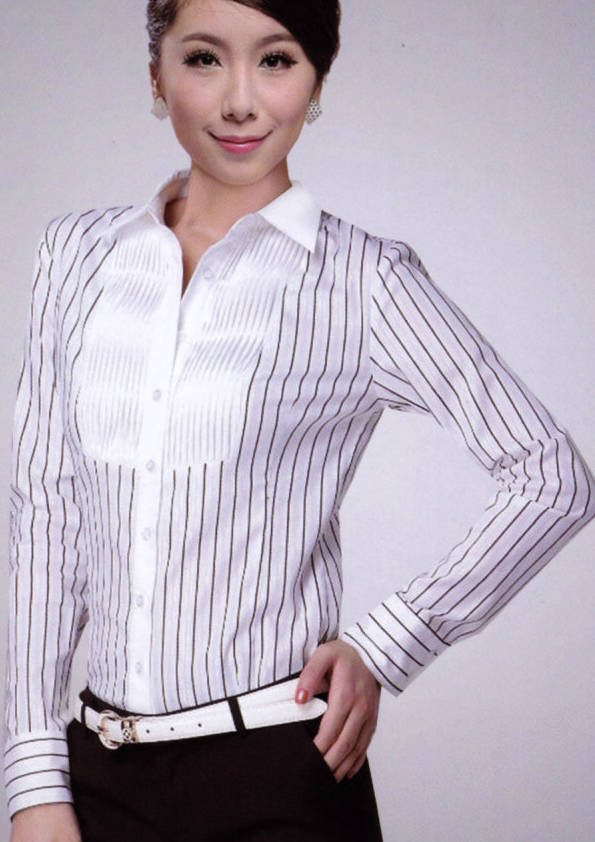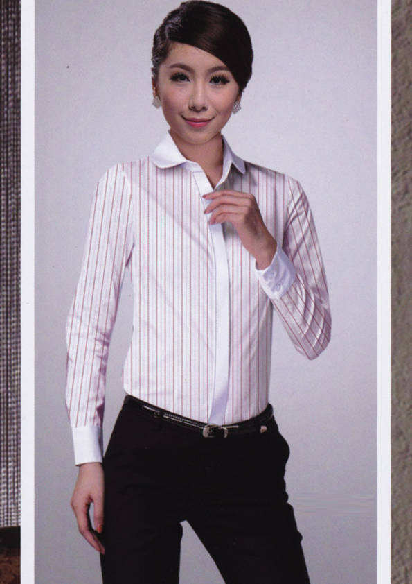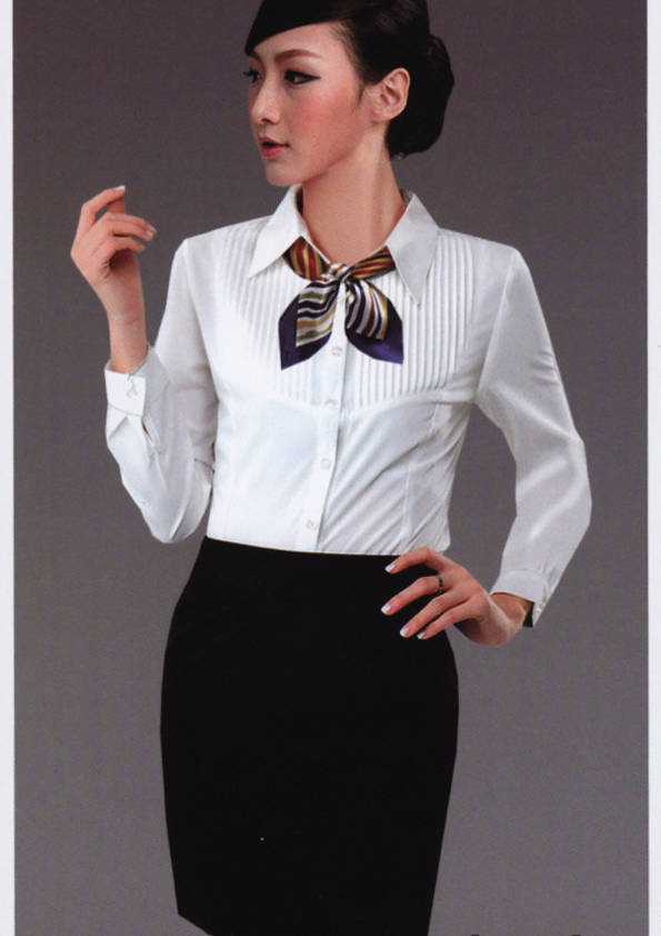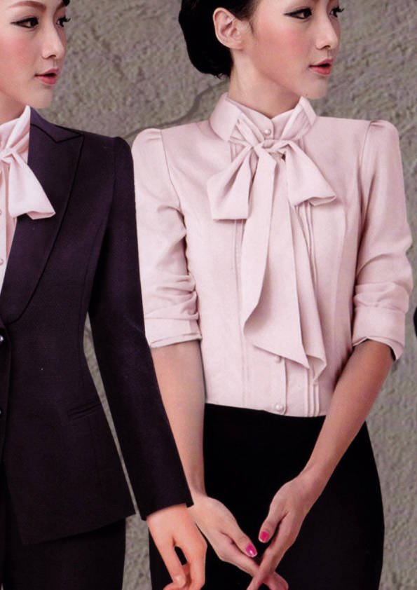 女衬衫是每一位女性必备的服装,也是款式变化最多、穿用时间最长、最能展现女性风采的服装。衬衫的颜色可以是多种多样的,只要与套装相匹配就可以了。白色、黄白色和米色与大多数套装都能搭配。丝绸是最好的衬衫面料,但是干洗起来可能会贵一些。另一种选择就是纯棉,但要保证浆过并熨烫平整。在正式场合,穿着要忌短、忌露、忌透。
